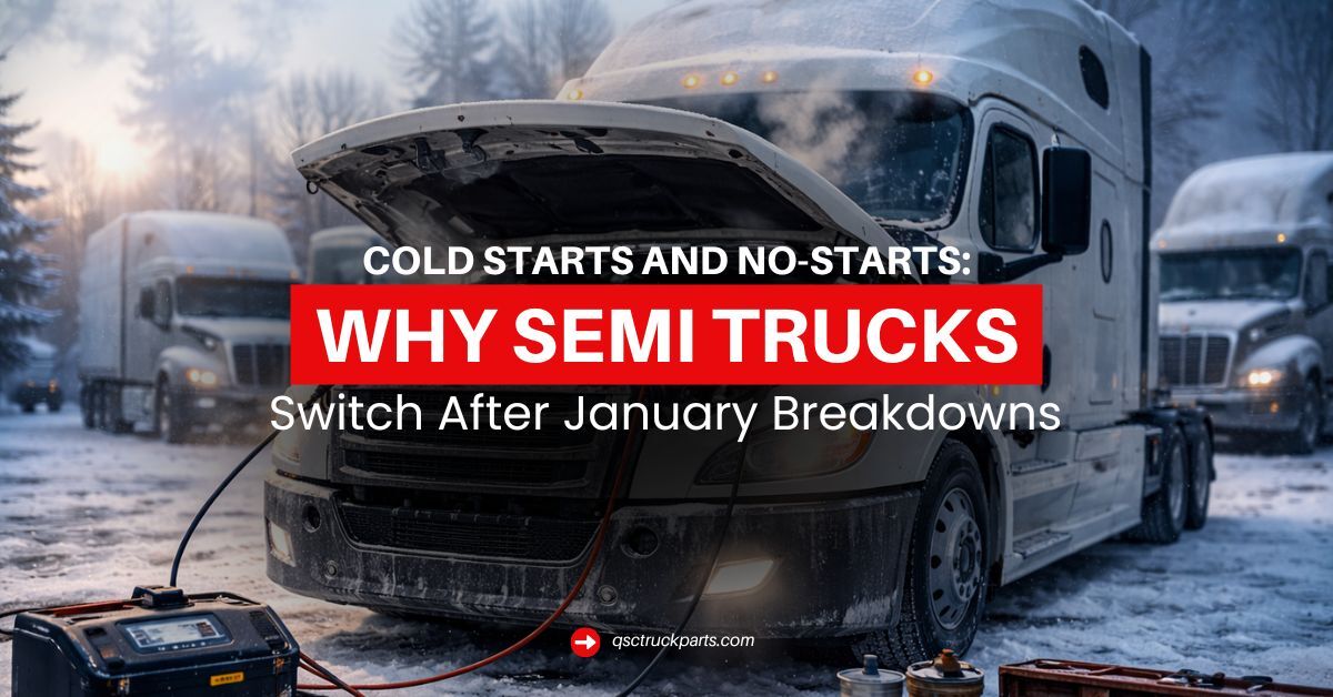 Semi trucks struggle to start in January due to reduced battery output, increased electrical resistance, thickened engine fluids, fuel gelling, and worn cold-start components. Replacing weak systems with reliable aftermarket semi truck parts significantly reduces winter starting failures.
